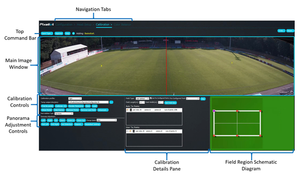 As part of the initial setup and configuration of the system, it is necessary to configure the calibration and color balance for the system. This procedure should be performed by a trained Pixellot support engineer. The purpose of this procedure is to assist the Pixellot algorithms in stitching the input from the two cameras into one seamlessly integrated image and to configure the desired color balance. The calibration procedure also defines the areas of the image that are relevant to the game action, enabling the Pixellot Automatic Production AI algorithms to focus on the essential activity.