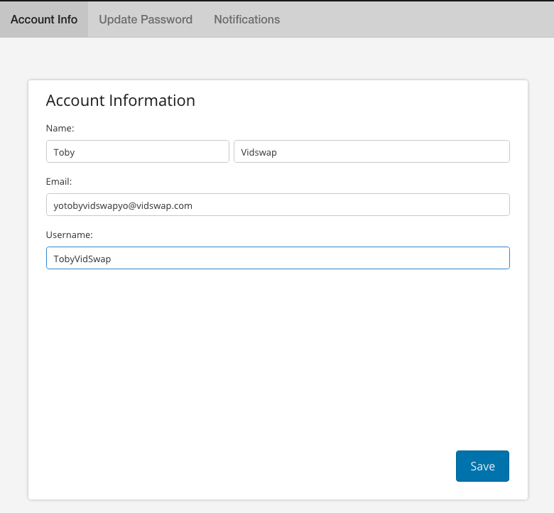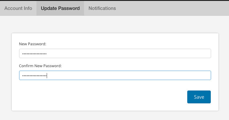 3. You can change your password by clicking on the 'Update Password' tab. Please be sure to press 'Save' when you finish the edits: