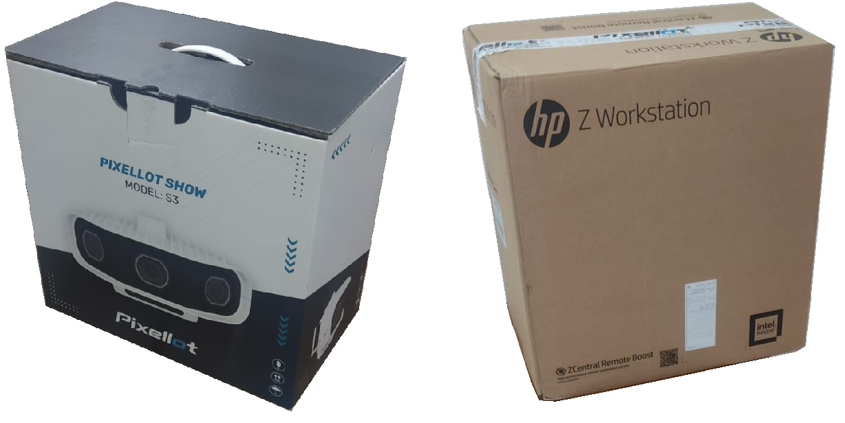 The S3 system comes packaged in two boxes. The Black Box contains Pixellot CHU and Accessories. The Beige Box contains the VPU, with power cable and mouse.